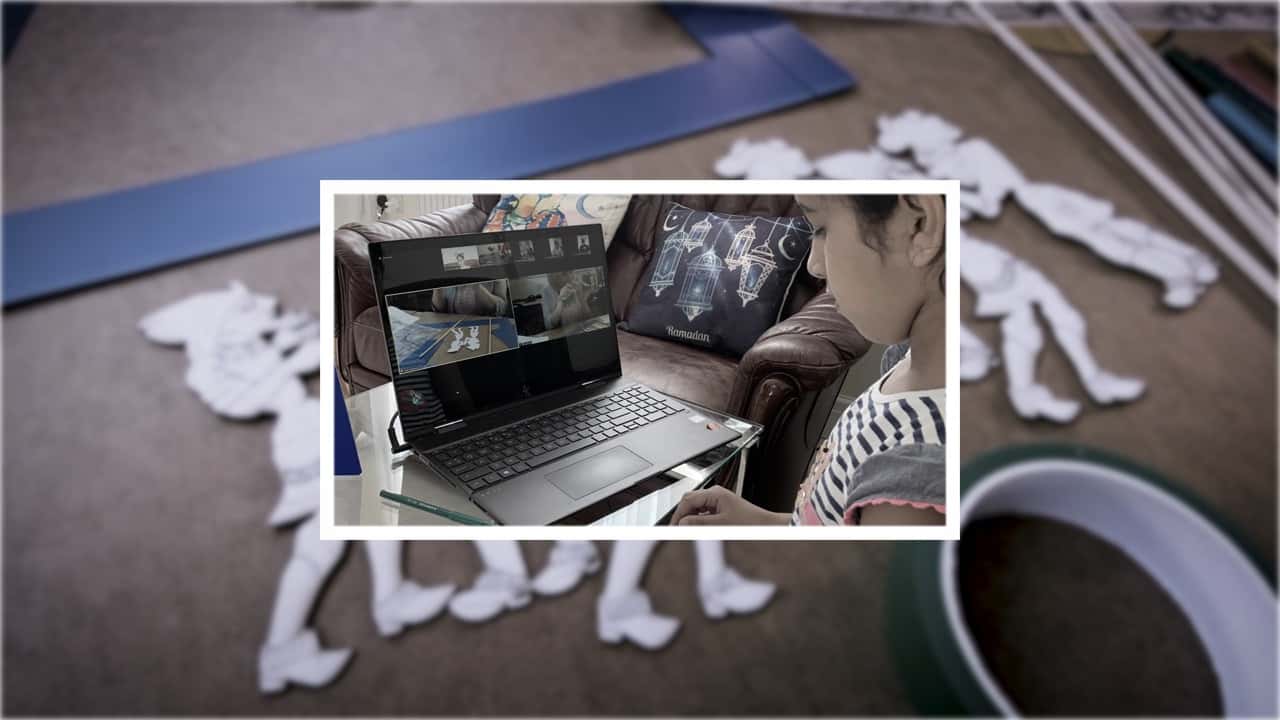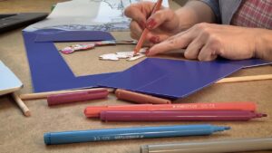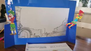 Celebrating Syrian shadow-play theatre, our online workshop introduced the children to traditional performing arts, focusing on shadow-play theatre. Activities involved building a theatre set, using a frame and a transparent paper/screen, depicting the Eastern Gate of Old Damascus. The children then coloured the two puppets and attached them to wooden sticks to create moving puppets – Karakūz and ‘Iwaẓ – and moved them while we told them a story. The workshop was run in English, but the story was told in Syrian Arabic.
