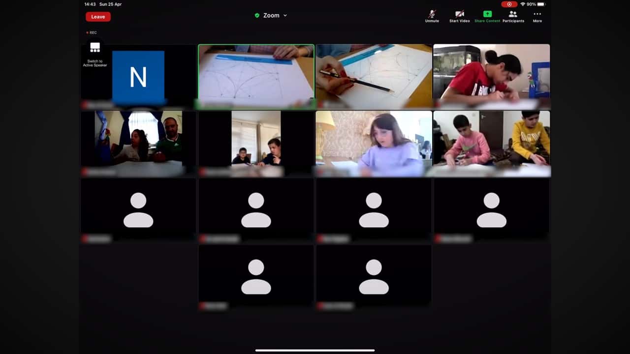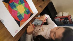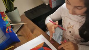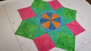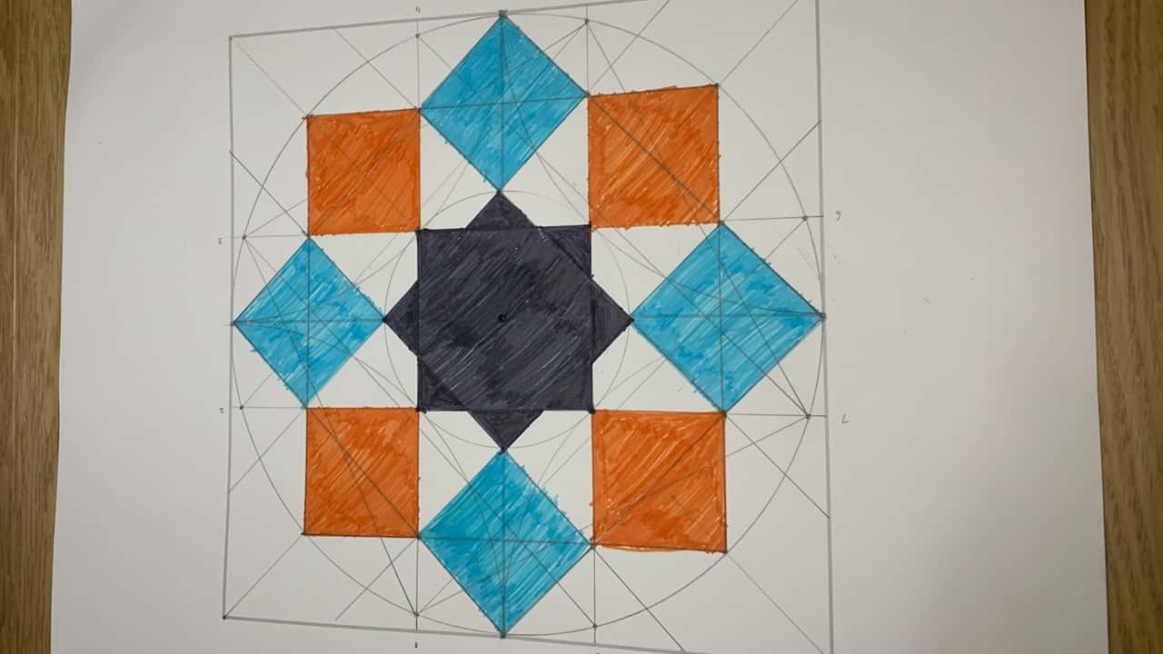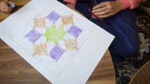 In our online workshop, the children started by drawing a square on a sheet of white paper. They then used a compass, pencil, ruler and colours to create the pattern. I guided them through the process and they were also supplied with an accompanying booklet that provided step-by-step instruction.