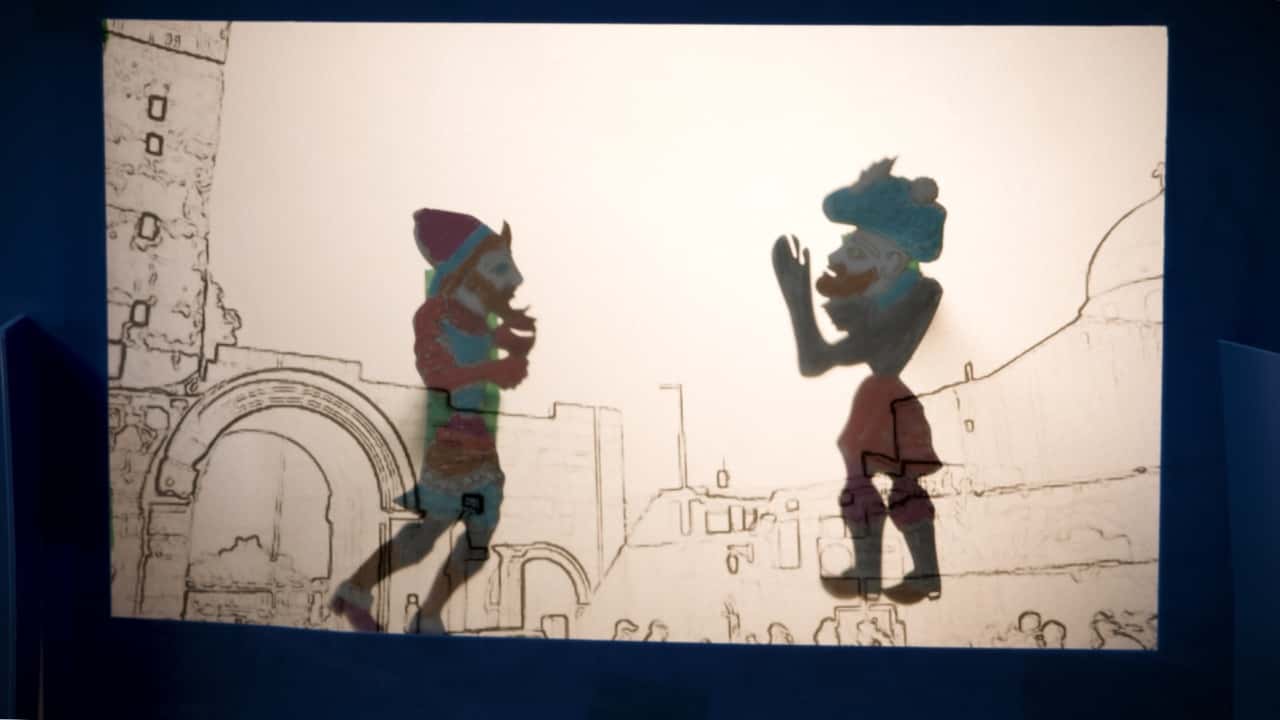 Shadow-play theatre is a traditional performing art featuring handmade puppets. Mukhāyil (a skilled puppeteer) moves the puppets behind a thin translucent curtain or screen inside a dark theatre.